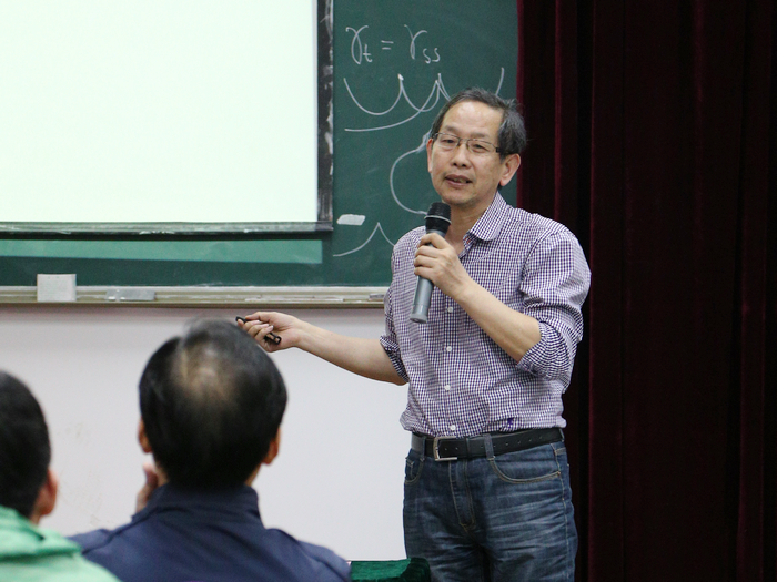 论坛上半场由张良云教授主持,两位家杰出青年获得者屈长征教授和楼森岳教授分别作了精彩的报告。屈长征教授主要从数学的角度出发、从经典的Cammasa-Holm方程入手,介绍了“可积方程尖峰孤子解的稳定性”的相关工作,以及与可积方程解的适定性问题相关若干最新进展;而楼森岳教授则从中国古代哲学思想“道生一,一生二...三生万物”出发,阐述了物理学中的一些基本原理,作了题目为《fromnothing to everything:discrete integrable system》的学术报告。在报告中,楼森岳教授介绍了“道生万物”与离散可积系统的内在联系、对现代物理学的意义以及急需解决的问题。报告内容深入浅出,通俗易懂,发人深思。