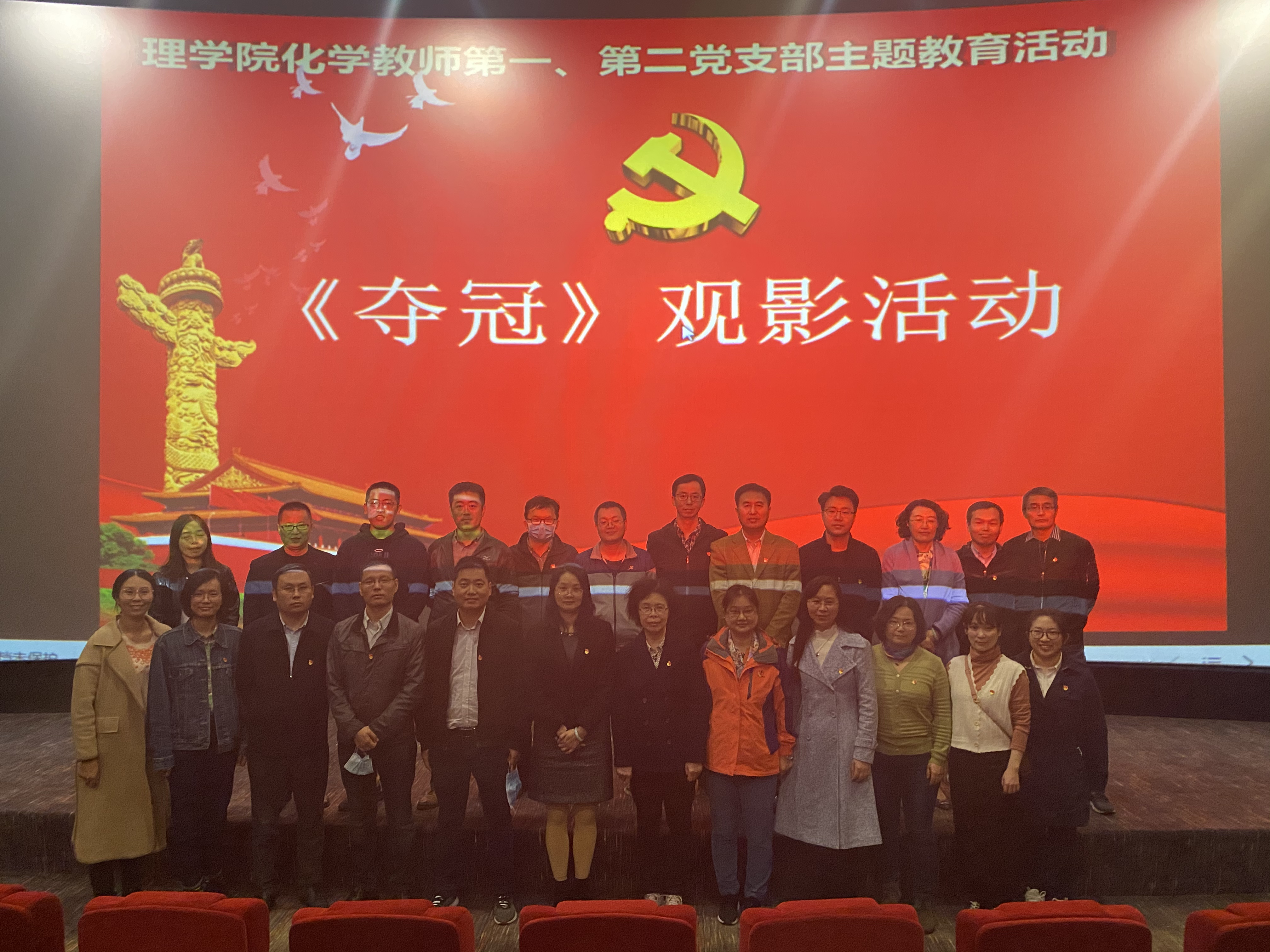 10月28日下午1:00,结合“四史”学习教育活动,为加强爱国主义教育,提高教师队伍凝聚力,营造团结向上的工作氛围,酒店偷拍 化学教师第一党支部和第二党支部组织全体党员和教职工观看了影片《夺冠》。