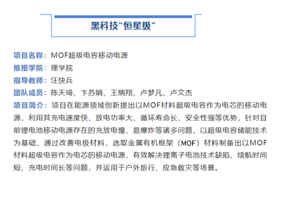 近日,第十八届“挑战杯”江苏省大学生课外学术科技作品竞赛黑科技专项赛事在常州大学落下帷幕。经过激烈的比拼,酒店偷拍 化学系由汪快兵老师指导,陈天琦、卢文杰等5位学生共同完成的《MOF超级电容移动电源》项目被评定为黑科技专项赛“一等奖”(恒星级)。