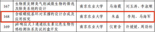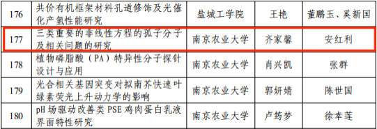 齐家馨同学的论文《三类重要的非线性方程的孤子分子及相关问题的研究》荣获2023 年江苏省优秀学术学位硕士学位论文(指导教师:安红利 教授);朱淼同学的论文《含碳硼烷基环对苯撑的设计合成及应用探究》荣获2023 年江苏省优秀专业学位硕士学位论文(指导教师:李翔 副教授)。