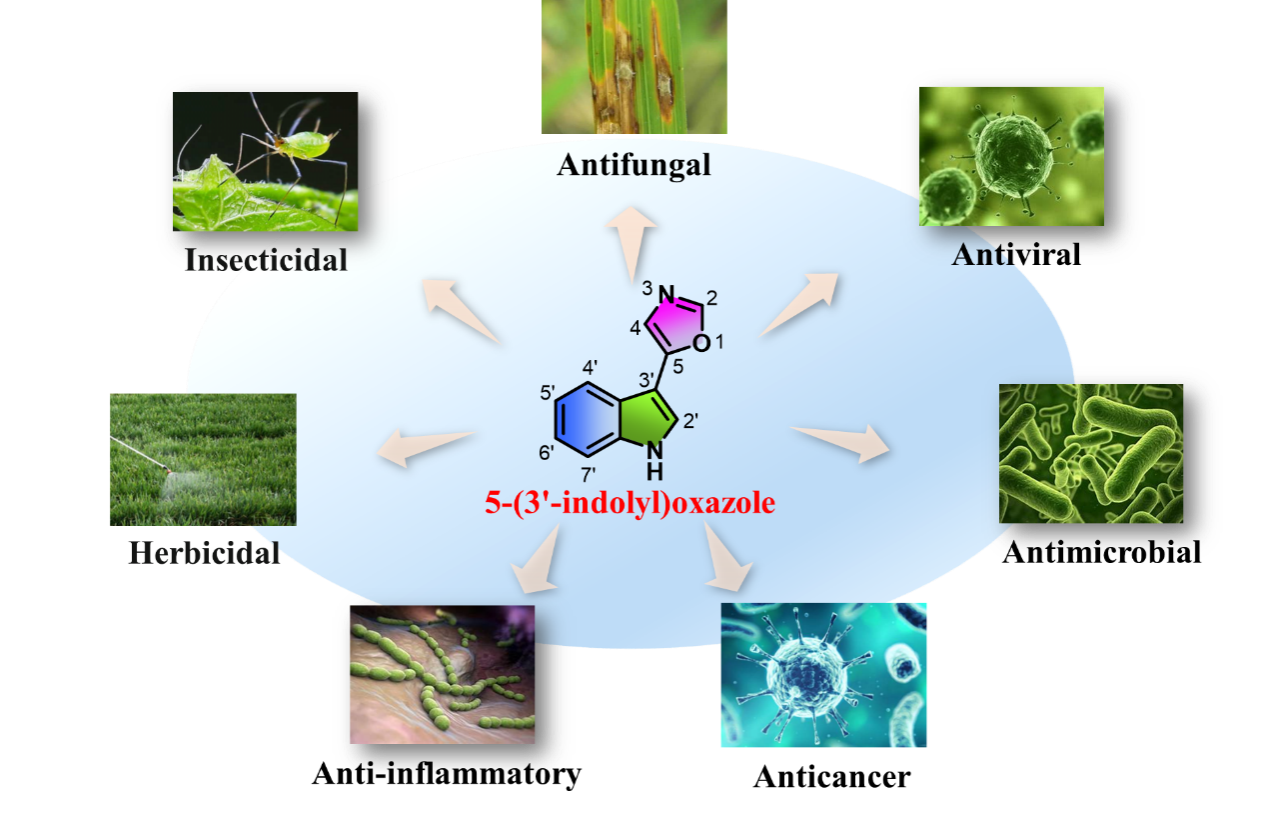 5-(3’-吲哚基)噁唑结构是一种独特的杂环骨架,存在于许多海洋天然产物和潜在的药物先导结构中。含有这种骨架的化合物,无论是天然源分离获取的,还是人工合成的衍生物,都表现出广泛的生物活性,例如Pimprinine(皮普利宁)和Streptochlorin(氯链素)两种天然产物都具有抗真菌和抗细菌活性,除此之外,皮普利宁表现出抗病毒和抗氧化活性,氯链素具有抗癌和抗炎活性。文章对含有5-(3’-吲哚基)噁唑结构的化合物包括抗癌、抗菌、抗病毒、抗氧化和抗炎等在内的众多生物活性进行了详细总结,涵盖团队前期研究发现5-(3’-吲哚基)噁唑类化合物表现出优异的农用生物活性,包括抗植物病原真菌、除草和杀虫活性等。