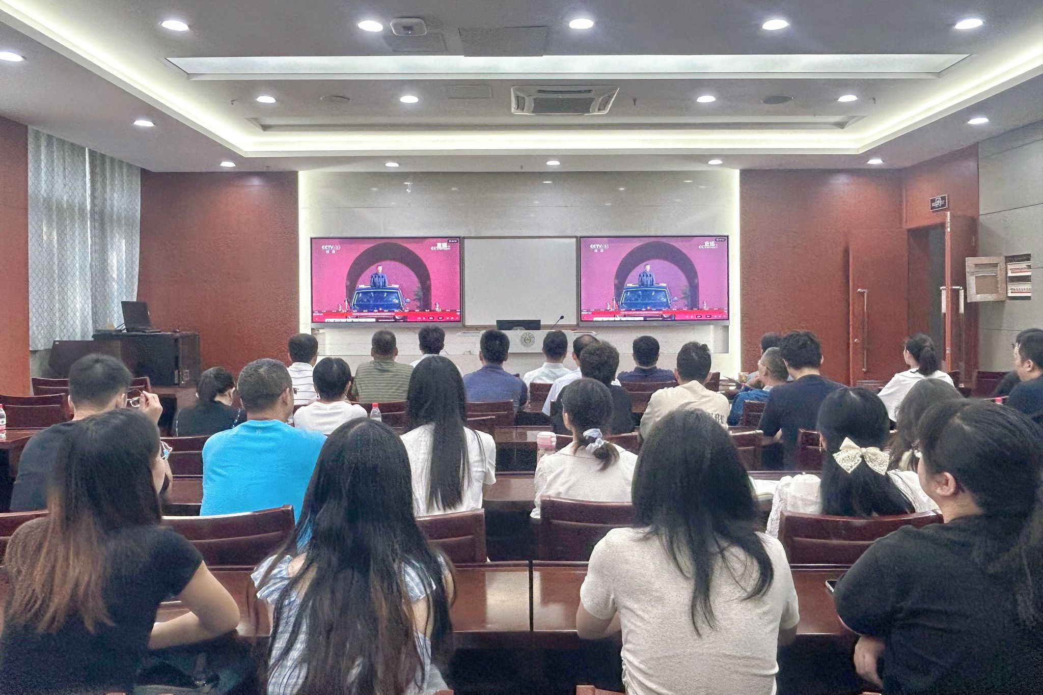 师生在教四楼B109报告厅共同观看了《纪念中国人民抗日战争暨世界反法西斯战争胜利80周年大会》。受阅部队官兵步伐铿锵、气势如虹,一系列国产尖端武器装备集中展示,生动展现了强国强军的辉煌成就,也更加具象地诠释了“国之大者”的深刻内涵和平安的坚实根基。这不仅是一场国威军威的庄严展示,更是一场生动的爱国主义教育。当听到现场“正义必胜!和平必胜!人民必胜!”的嘹亮口号,师生们深受感染,欢欣鼓舞,掌声不断。