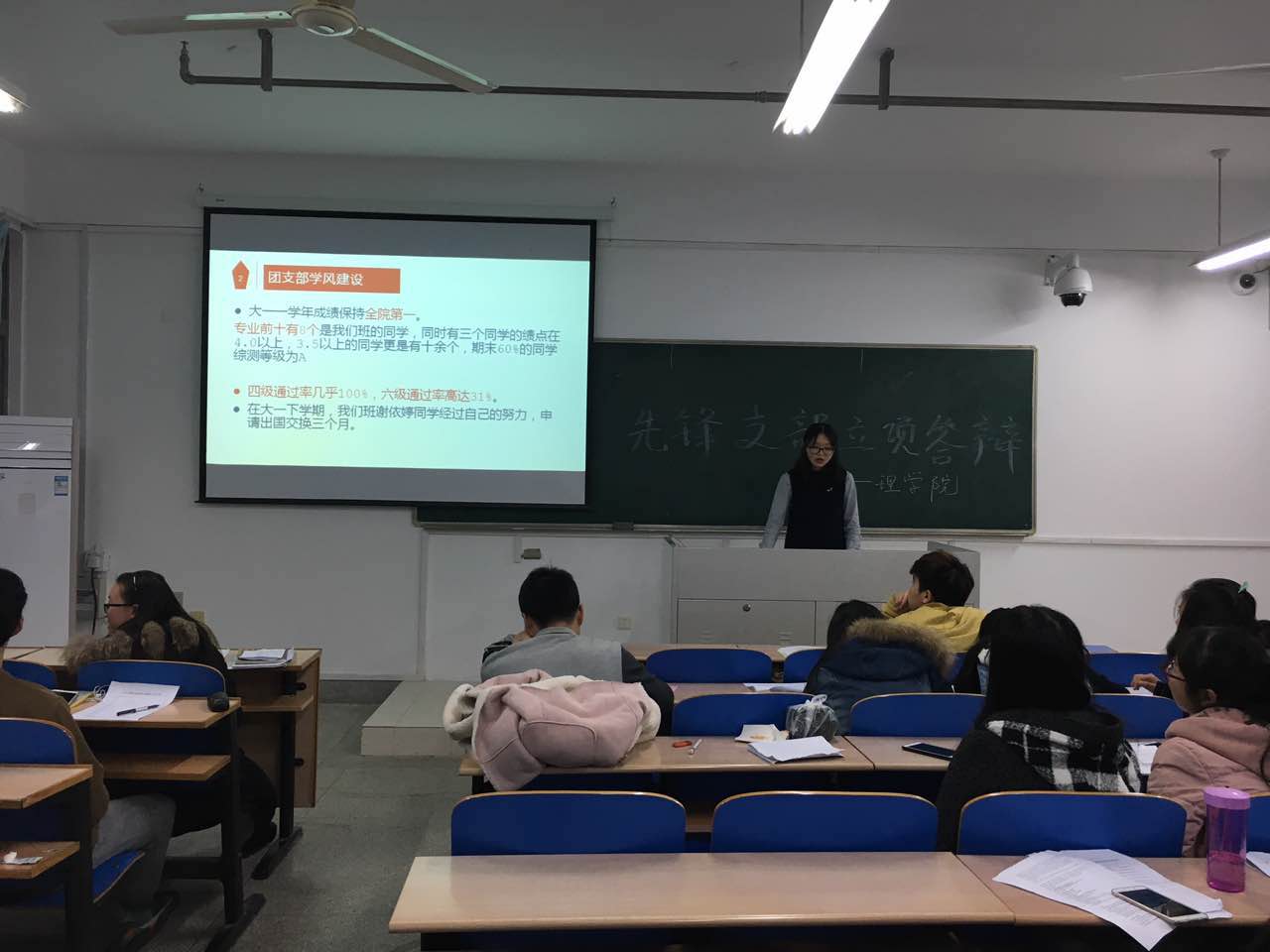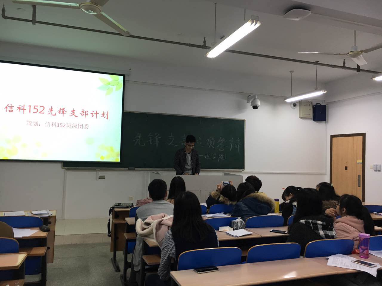 先锋支部立项答辩准时在教四楼B404开展,由辅导员黄芳老师、大二先锋支部(应化151)班干部四名、酒店偷拍