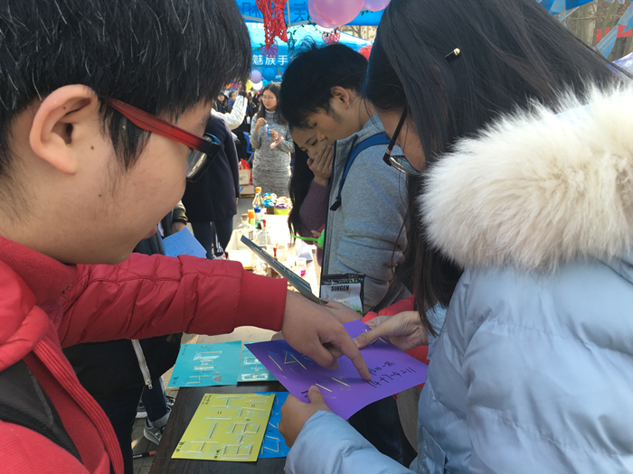 的摊位经过了同学们的精心布置,在众多摊位中也丝毫不见逊色。我们凭借独特奇妙的化学原理组织了有趣的比赛活动,将乐趣与知识结合,获得一致好评。通过各种试剂欢乐吹泡泡,带领大家回到童年的时光;利用酸碱滴定原理分辨不同浓度的碱性样品,使大家领略实验的魅力;还有趣味数学,移动牙签使等式成立,让大家在体验游戏的同时,也感受到理学的美好……形式多彩的游戏及精美的小礼物吸引不少同学踊跃参加。