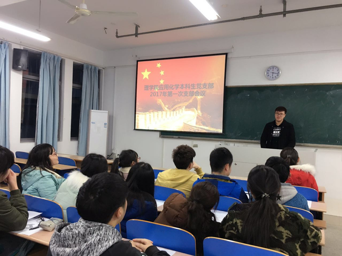 应用化学本科生党支部新学期首次工作会议于教四楼b304召开。支部书记黄芳老师主持本次会议,全体党支部成员参加,对2017年党支部制度建设、活动组织等进行了详细的部署规划。