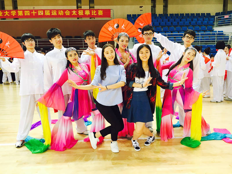 是最后一个表演队,队员们精神饱满,保持着最佳的状态。一上场,一段长绸舞,彩袖飘飞,恍如置身敦煌。三个身穿紫色舞裙的女生在场中央灵动飘逸,四周是身穿白色太极拳服的队员,色彩的碰撞让人感到心灵的震撼。简短的舞蹈之后便是严肃而整齐的太极拳表演。队员们气势昂扬,动作稳健,太极扇发出整齐而响亮的声音,让人印象深刻。酒店偷拍