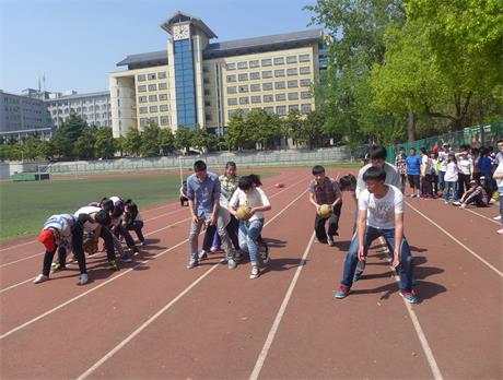 “双龙戏珠”即双人夹球运动,要求队员背靠背夹住排球并进行较快的移动。比赛以班级为单位,将每个班的八人分成两大组分别站在起点与终点处,以接力赛的形式进行。