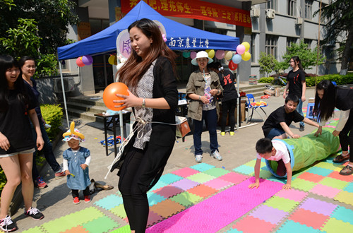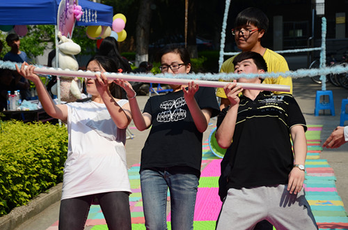 学生,连外院学生也跃跃欲试,纷纷加入到了报名的队伍中。第一关“酸爽活力跳”是在指压板上跳绳,让参与同学充分感受了指压板按摩脚底的“酸爽”,参与者层出不穷的尖叫声,搞笑的动作让周围的人不禁捧腹大笑;“鱼跃龙门”——在腿间夹气球高跳拍系在两杆间的羽毛球,不仅考验大家的忍耐力还有击球的准确度;“小鹿乱撞”是公认最“酸爽”的一关,在指压板上跳扭着把系在腰上纸巾盒中的乒乓球甩出来,大家或是金蛇狂舞,或是左右颠簸,动作好不逗趣,观看的同学都开心不已,忍不住拍掌大笑。无论是“甜蜜瞬间”的戴着气球帽子吃糖,还是拿着里面放着一排乒乓球的塑料管过杆子的“四平八稳”,以及最后“信仰之跃”都是妙趣横生,令人忍俊不禁。