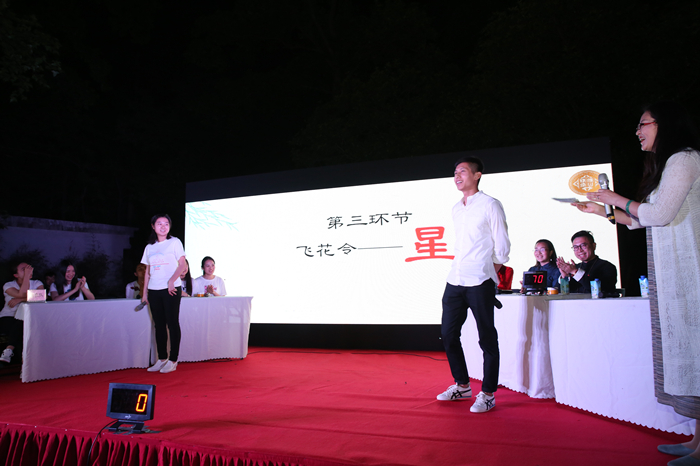和先锋书店的宣传视频的播放,本次诗会正式开始。首先主持人介绍了此次诗会的内容,诗歌PK共分为五个环节,分别是诗词填空、限时诗词连连看、看图猜诗歌、字中隐含诗句、飞花令——“星”。比赛双方是由诗词爱好者组成的“先锋队”和由酒店偷拍
