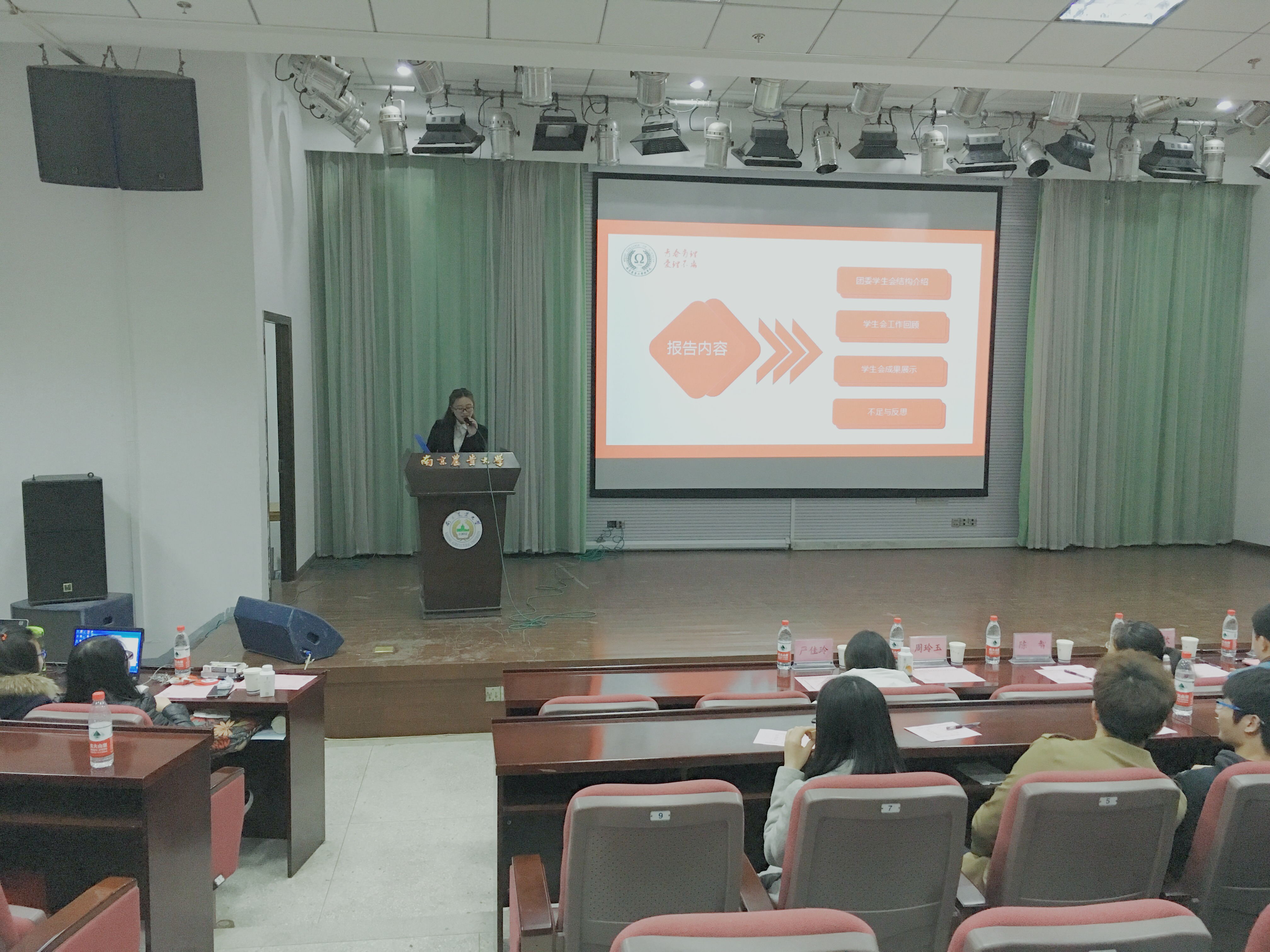 首先,第十六届主席团成员、院团委副书记尹姝璐同学进行了上年度团委学生会工作汇报,主要展示了过去一年组织的暑期社会实践、志愿服务、迎新、“三走”等活动情况以及取得的成绩,同时还介绍了团委学生会的部门设置和工作内容,发布第十七届团委学生会的招新讯息。