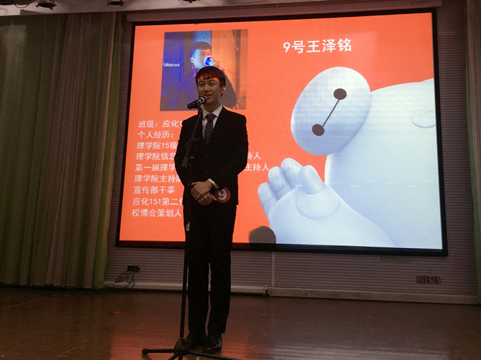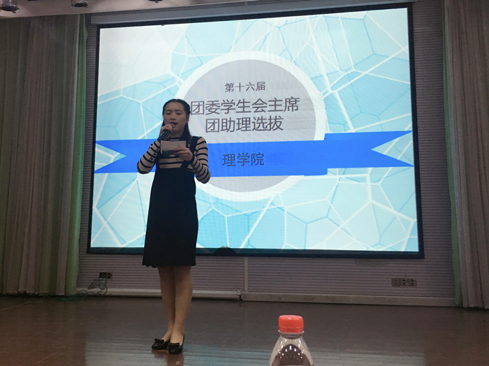 随后,第十六届主席团助理选拔正式开始。经过前期的个人报名,选拔培训,此次共有12名2015级学生进入选拔最后阶段。先是每个选手结合自身实际进行了3分钟的个人演讲并回答现场提问,演讲内容从担任学生干部的责任,到台前幕后工作的区别,到遇见更好的自己如何追求,再到对于声音魅力的独特见解,选手们语言风趣幽默,个人特色明显,回答机智有见地,很好的展现了竞选学生的个人基本素质。