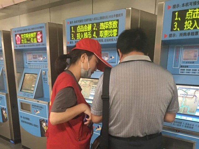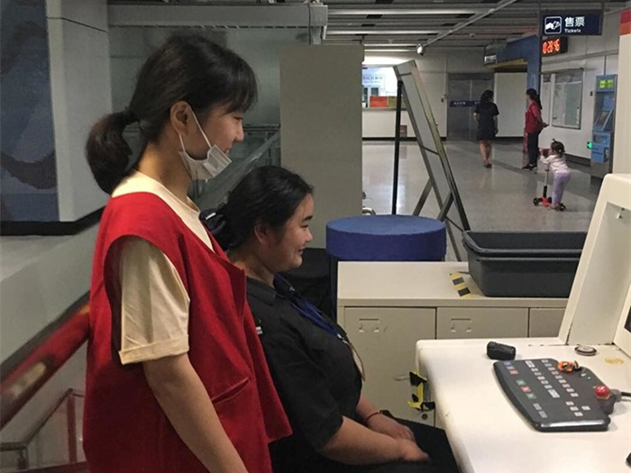 地铁站志愿服务的“小红帽”们分为两组,每组五人。服务站岗的时间是早上的九点到十二点,下午的两点到五点。每组有2名成员在地铁站售票处协助买票、2名协助安检,还有1名站在检票口或者出站口引导乘客进出站。