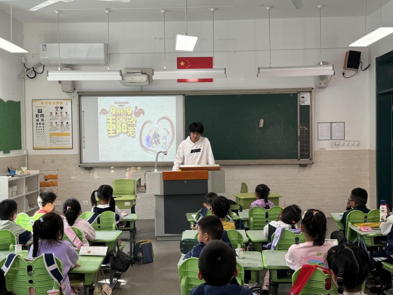 首先,志愿者播放了一段趣味视频,初步介绍了重阳节。同学们全神贯注地观看,积极回答视频后的问题,现场氛围欢快轻松。接着,志愿者详细讲解了重阳节的历史来源与风俗习惯,同学们听得津津有味,纷纷举手分享吃过的重阳节美食,场面其乐融融。互动中,同学们不仅加深了对重阳节的了解,还感受到了传统文化的魅力。