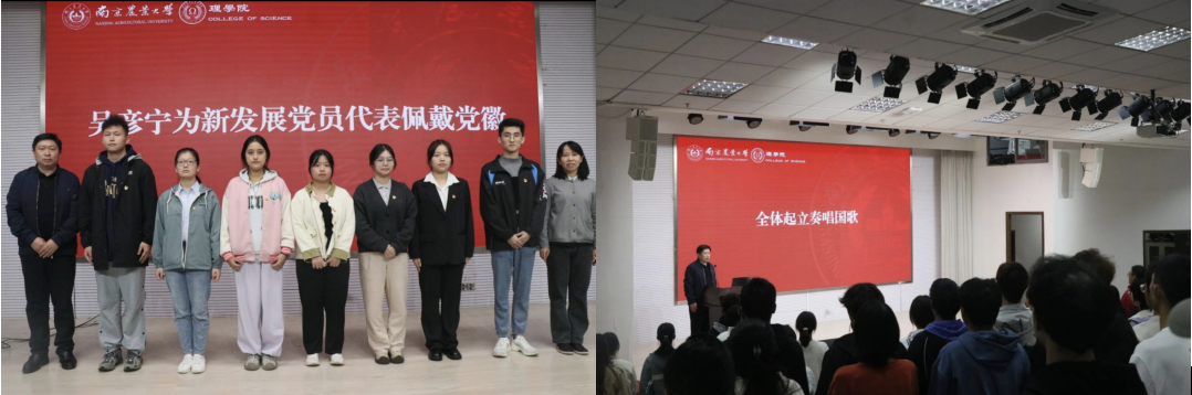 各领导为预备党员佩戴党徽,表达了党组织对各预备党员的庄严认可。奏《中华人民共和国国歌》,全体起立,齐唱国歌。