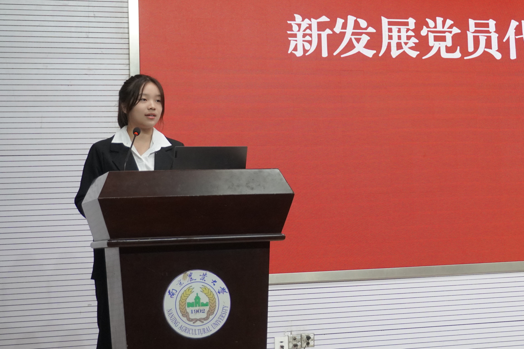 其次,2024年春季新发展预备党员方晴霜进行发言。她分享了自身的学习经历,看到了中国共产党制度的优越性和先进性,同时,她告诉同学们,加入中国共产党意味着要肩负更多的责任,需要更强的责任感和使命感。最后,她还强调了要不忘初心,“把初心落在实际上”。