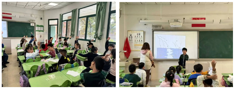 随后,迎来了同学们期待已久的小游戏环节。第一项游戏是让同学们拿出一张纸,用彩笔在纸上描绘出想要表达的情绪。同学们纷纷用画笔大胆描绘自己心中的情绪,每一笔都充满了童真与童趣。画完后,志愿者挑选出优秀的作品进行展示,让同学们猜测所展示的情绪。令人惊喜的是,同学们都能心照不宣地猜出正确答案。第二项小游戏则是志愿者给每个小组第一排的同学发放有关情绪的词,同学们通过肢体语言依次向后一位同学传递该情绪,由最后一位同学猜出该情绪是什么。同学们用自己的肢体语言诠释着各种情绪,夸张的表情与动作逗得大家哈哈大笑,现场氛围瞬间热闹起来。课堂上欢声笑语,经过精彩的游戏环节,大家发现,每个同学对同一种情绪的理解和表达方式都不尽相同,这也让大家对情绪有了更深层次的认识。