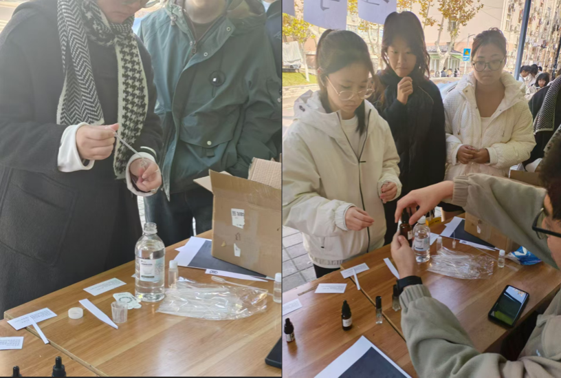 步入正在举办香水科普活动的玉兰路,仿佛踏入了一座神秘的芳香王国。同学们摇身一变,成为了魅力非凡的 “调香大师”,工作人员以深入浅出的方式,从香料复杂而精妙的化学成分讲起,逐步揭开了隐藏在香水中神秘的 “科学密码”。大家仔细聆听着不同香料特性的讲解,亲眼见证它们在工作人员手中巧妙搭配、缓缓挥发的神奇过程,深刻体验了香水在鼻尖上 “演绎” 出的前调、中调与后调,香味的变幻如交响乐般美妙。