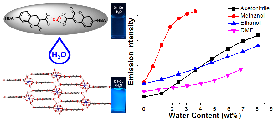 本工作中,章维华教授课题组提出在原位生成香豆素荧光配合物的方法对目标体系中的水份进行检测。研究表明香豆素 D1 和D2 在常见有机溶剂如乙腈、甲醇、乙醇、DMF和THF中可以快速地与Cu2+配位得到对应的D1-Cu和D2-Cu配合物。D1-Cu和D2-Cu配合物的形成导致香豆素 D1 和D2的荧光被淬灭。而当D1-Cu或D2-Cu配合物暴露在水份中时,溶液的荧光明显增强。紫外-可见吸收光谱、荧光光谱、核磁氢谱以及单晶衍射数据表明,D1-Cu和D2-Cu配合物遇水荧光增强的可能机理在于形成了对应的以水为桥联的三维超分子网络结构,该结构的形成使 D1 和D2分子内电荷转移 (ICT) 状态发生了改变。此外,通过对比实验发现,如果香豆素7-位缺少氢键受体 (如D3),则对应的香豆素配合物D3-Cu对水没有荧光增强响应。