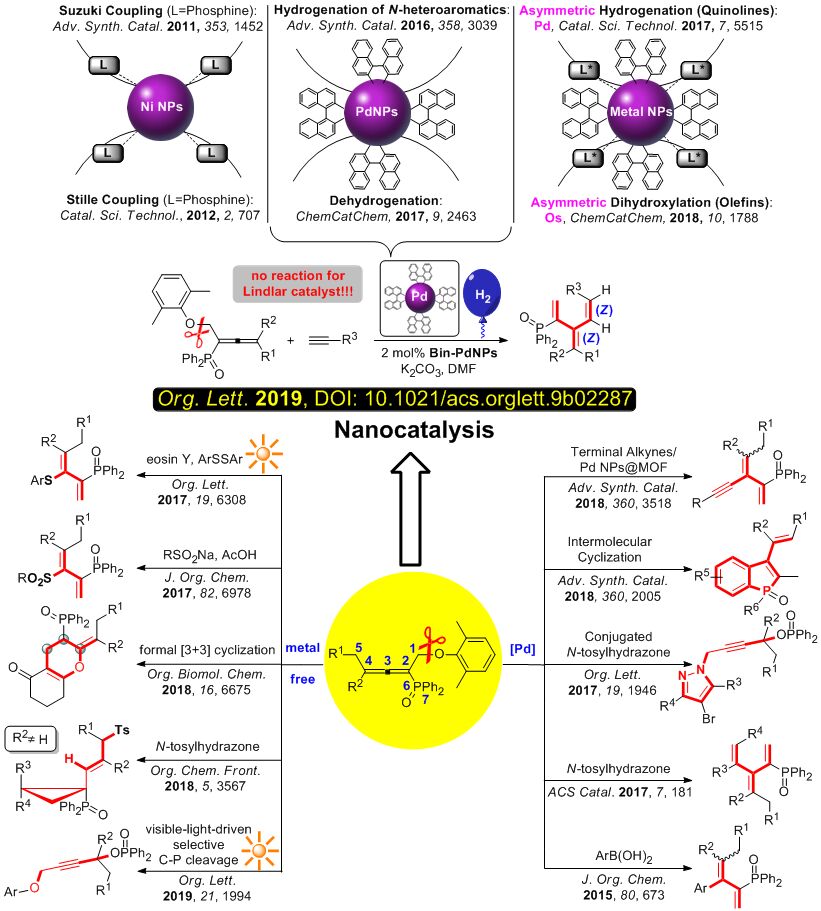 吴磊教授课题组在国际权威刊物Organic Letters(美国化学会-有机通讯,SCI-IF2018: 6.555, organic chemistry ranking: 2/57)在线发表了题为“Cascade Alkynylation and Highly Selective Hydrogenation Catalyzed by Binaphthyl-Palladium Nanoparticles Accessing Phosphinyl (Z)-[3]Dendralenes” 的研究论文。酒店偷拍