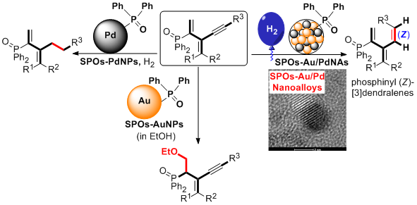 由于合金效应和更有效的簇间电子传输效应,纳米合金往往表现出比单一金属纳米簇更独特的催化活性、稳定性以及选择性,因此成为纳米催化和非均相催化领域的热点问题之一。其中,钯-金纳米合金作为一类“明星”催化剂而备受关注。次级磷氧化物(Secondary Phosphine Oxides, SPO)一类特殊的五价膦配体,与传统三价膦配体相比,对水和空气更加稳定,使其成为理想的纳米合金稳定剂。近日,吴磊教授课题组首次发展了以次级磷氧化物为稳定剂制备系列新型钯-金纳米合金,通过高分辨透射电镜、X-射线电子能谱、X-射线粉末衍射、能量色散X射线荧光光谱等(HR-TEM、XPS、XRD、EDX-Mapping、ATR-FT-IR、ICP-MS、UV)表征手段证实了钯-金合金的存在及其分布状况。该系列催化剂还被成功运用于共轭烯炔的选择性氢化及加成反应,研究发现钯与金含量的变化可以精确调控催化反应的类型与区域选择性。