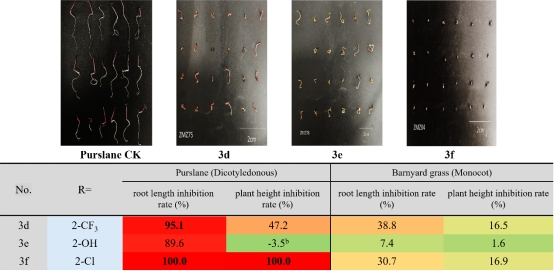 科学家发现一个有趣的现象:在苹果园中,相比于没有落叶的地面,有落叶覆盖的地面上杂草更少。基于这种有趣的自然现象,科学家们从苹果树落叶等组织中提取获得活性天然产物根皮素,并通过研究证实:根皮素是一种具有抑制杂草生长的活性分子。本研究以根皮素为先导分子,结合骨架迁移、活性亚结构拼接和生物电子等排原理,设计并合成了三个系列共57种衍生物分子;通过种子萌发和生长活性测试表明,在50 μg/mL浓度下,系列3中多个化合物对单子叶代表性杂草稗草和双子叶代表性杂草马齿苋表现出优秀的抑制活性,其中3f、3h、3j、3s等对马齿苋的根长和株高抑制率高达100%;同时,高活性化合物对双子叶代表性作物油菜表现出良好的安全性。值得一提的是,部分化合物对油菜还表现出一定的促进生长作用。