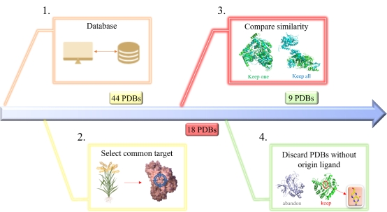 为了探寻其可能的作用机制,我们采用基于人工智能的虚拟筛选技术,最终得到2个潜在的作用靶点。首先,在靶标数据库中筛选出常见的除草剂靶点,得到44个PDB;然后,通过它们的相似性比对,筛除具有相似分子结构和活性空腔位点的同源蛋白,保留具有不同活性位点和空间结构的蛋白,最终得到9个PDB;最后,完成高活性分子与潜在靶标的相互作用分析,通过分子对接和打分排名,通过结合能打分判断其结合情况,筛选出原卟啉原氧化酶(PPO)和八氢番茄红素去饱和酶(PDS)可能是根皮素衍生物除草活性的潜在作用靶点。后续研究工作正在开展中。