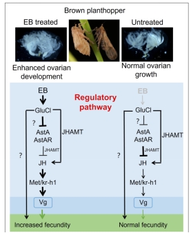 在昆虫体内,有一种叫“抑咽侧体素A(AstA)”的神经肽,它的作用是抑制保幼激素的合成,相当于繁殖系统的“刹车”。而甲维盐等农药会通过作用于褐飞虱体内的谷氨酸门控氯离子通道(GluCl),降低AstA及其受体(AstAR)的活性,相当于松开了保幼激素合成的“刹车”。